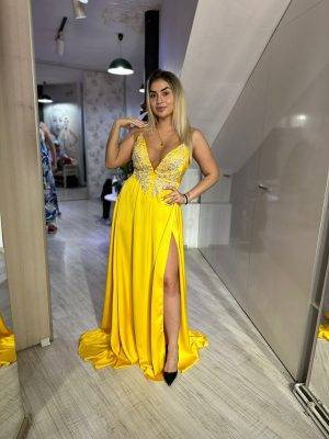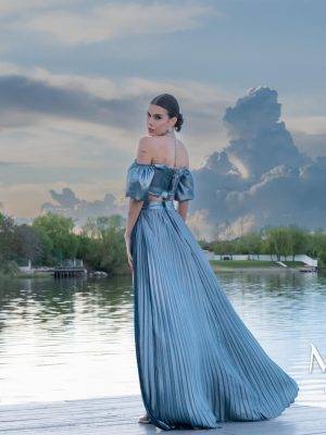 Rochie lunga,cu maneci lungi bufante.decolte in V,umeri goi,talie marcata cu un cordon si fusta lunga,larga cu crepatura pe un picior.Inchiderea se face cu fermoar la spate.
