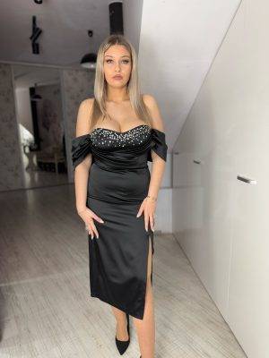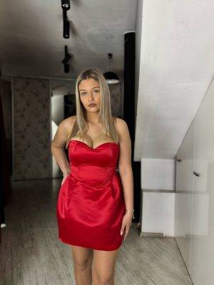 Rochie lunga rosie accesorizata cu pietricele argintii