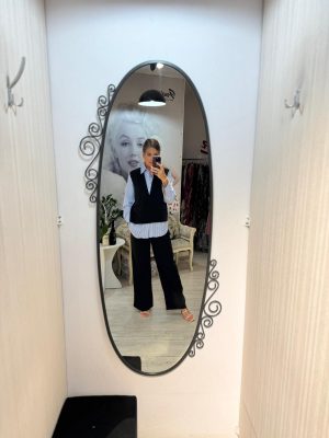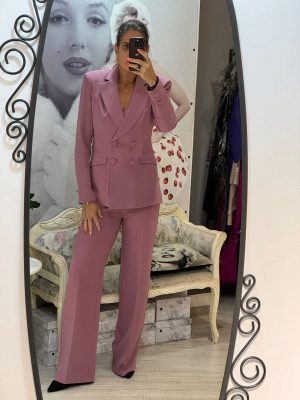 Compleu alb,foarte elgant,format di 2 piese,sacou si pantaloni.Sacoul este cambrat,cu decolte adanv=c in v si un singur nasture discret in talie,care subliniaza silueta.Umerii sunt acccesorizati cu detalii stralucitoare din lanturi si aplicatii tip perle,iar mansetele sunt decorate cu pene albe delicate,oferind un aer glam.pantalonii cu croiala conica si lungime 7/8,complecteaza perfect tinuta.