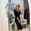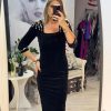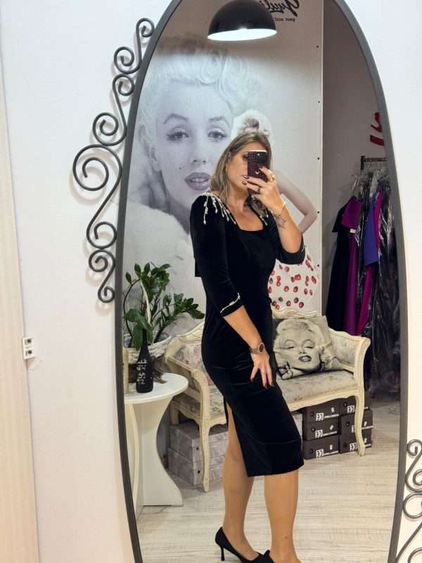 Rochie midi neagra din catifea cu umeri accesorizati
