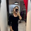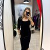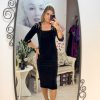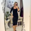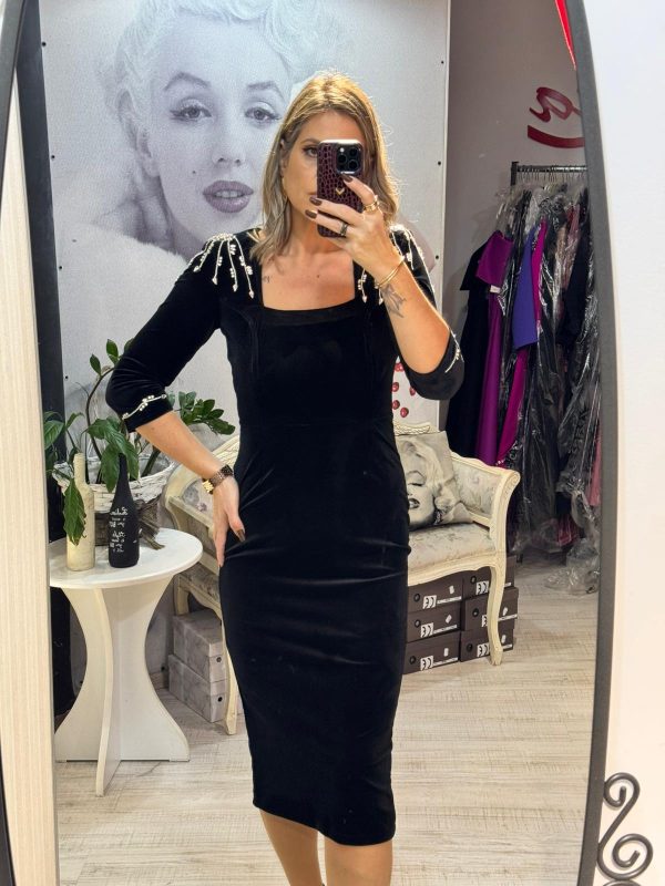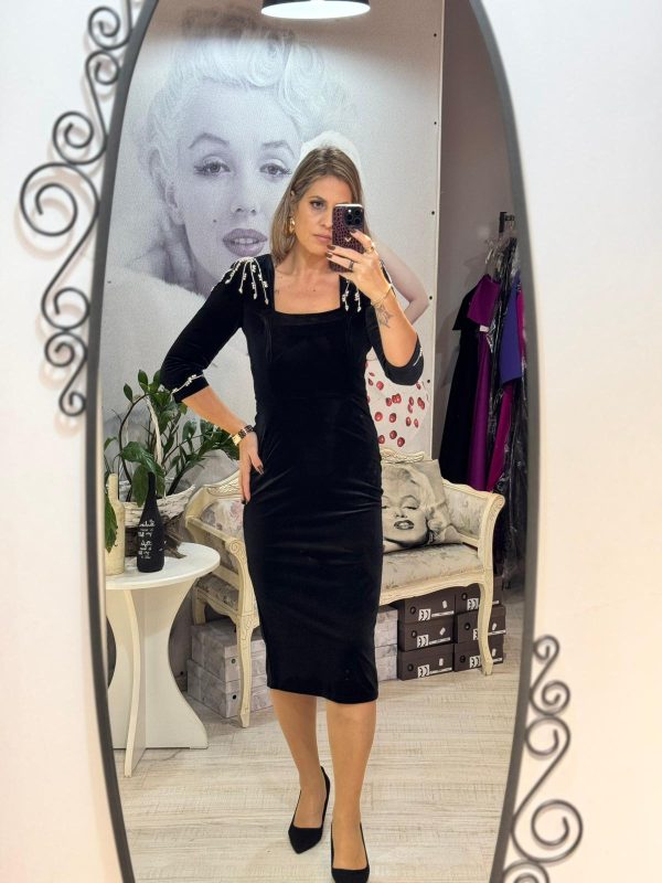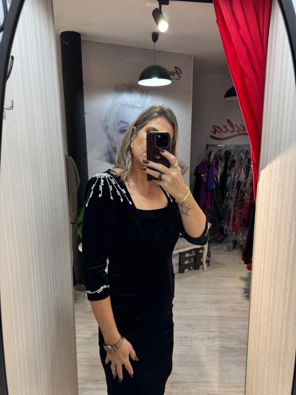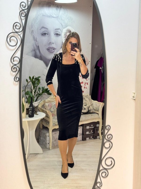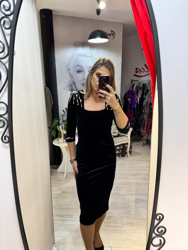 Rochie neagra din catifea fina,avand croiala pe corp,pune in valoare silueta si ofera un aer sofisticat.Decolteul patrat si crepatura la spate ofera un plus de feminitate si rafinament.Manecile 3/4 si linia simpla a rochiei,echilibreaza perfect tinuta.Unewrii sunt accesorizat cu cristale argintii,iar inchiderea se face cu fermoar la spate.