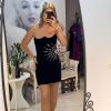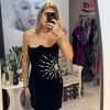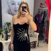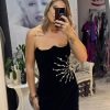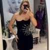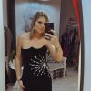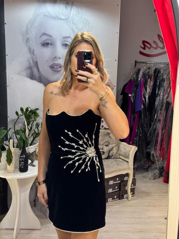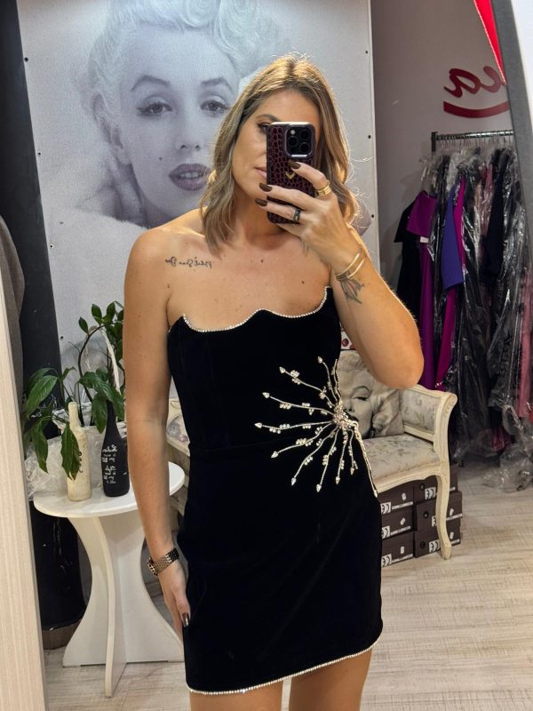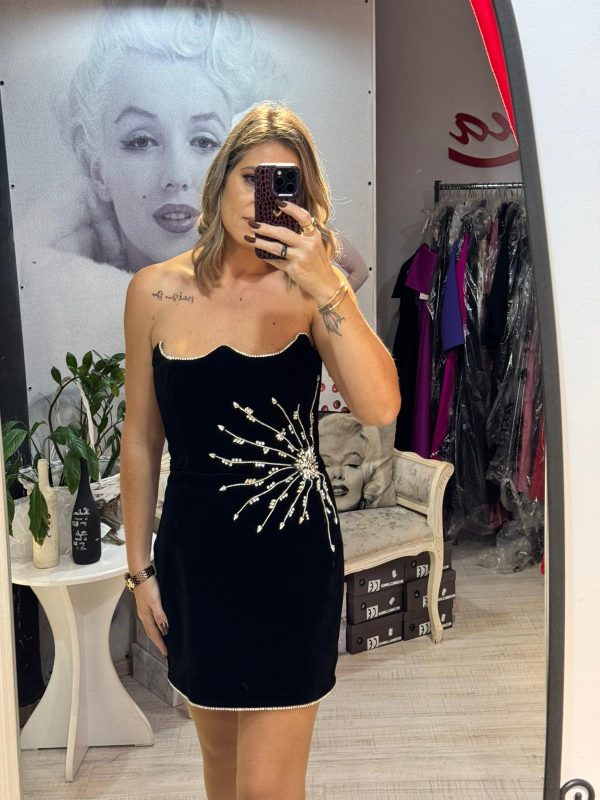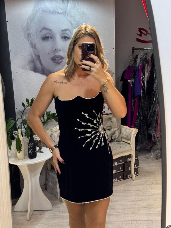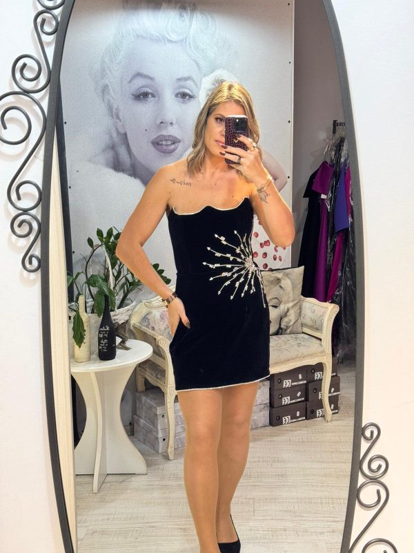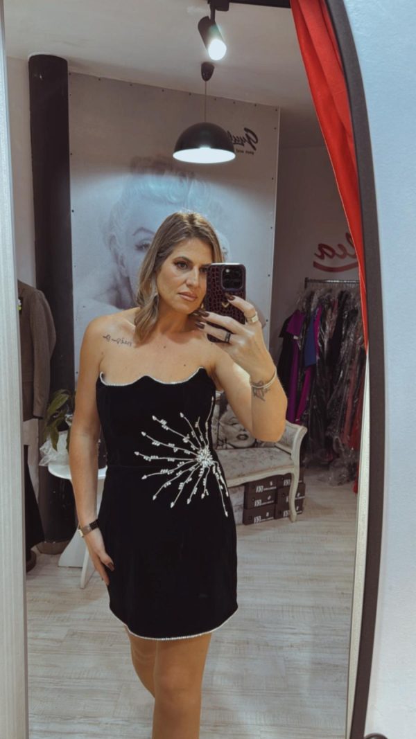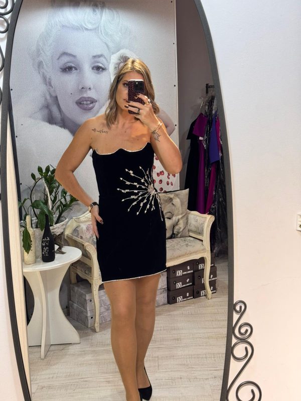 Rochie neagra,scurta,din catifea,avand un croi mulat care pune in evidenta silueta,iar decolteul indraznet adauga un plus de feminitate.Materialul catifelat confera un aspect luxos si rafinat,iar textura moale ofera confort la purtare.Rochia este completata de accesorii pretioase din cristale,care aduc un detaliu senzual,dar discret.