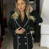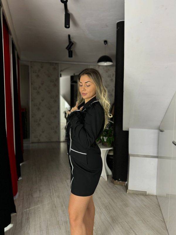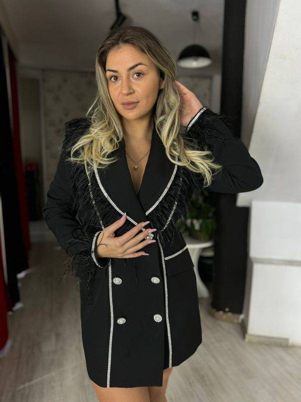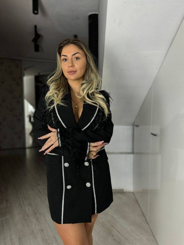 Rochie sacou neagra,extrem de eleganta,cu maneci lungi accesorizate cu pene la mansete.Reverele sunt intoarse accesorizate si ele cu pene si un sir de cristale argintii.Talia este si ea marcata de sase nasturi argintii extrem de eleganti.fusta este modi ,parte peste parte.